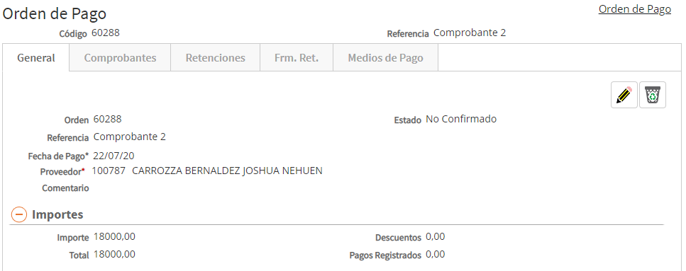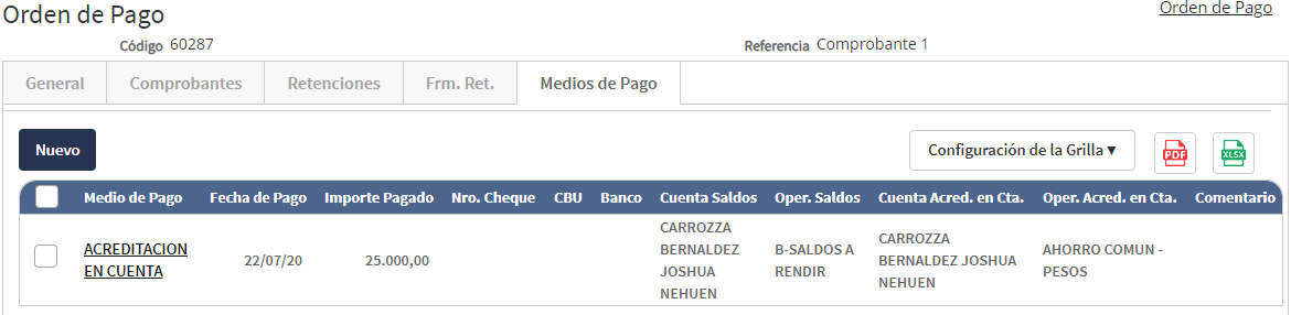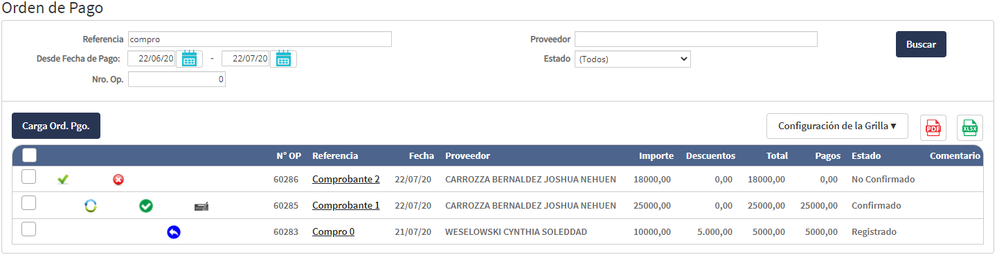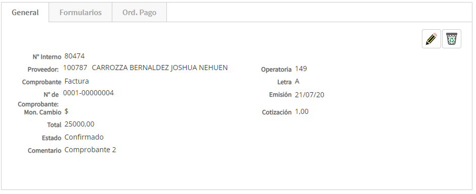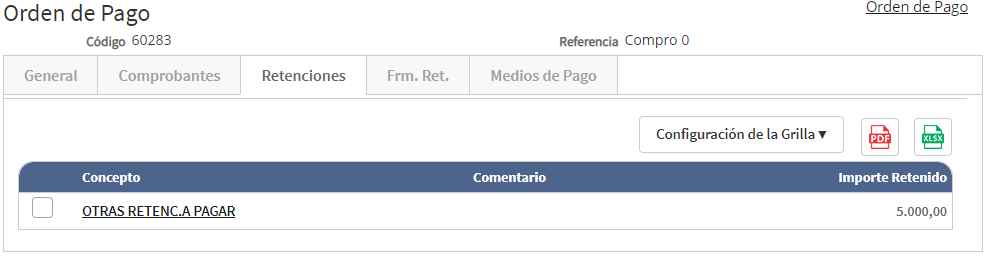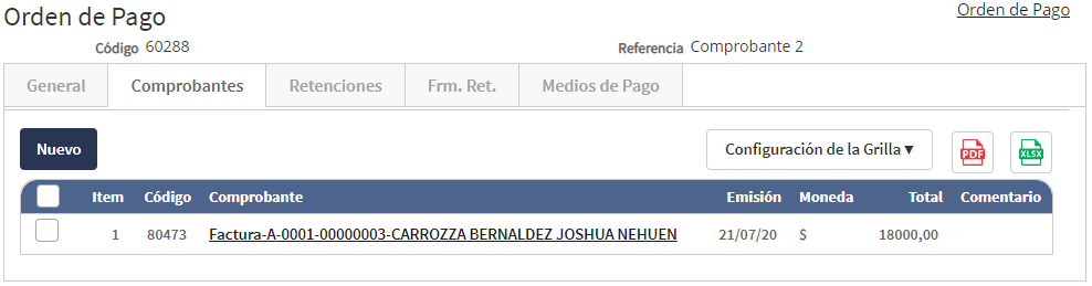 Ord. Pago: Se puede visualizar la Orden de Pago que tenga asociada este comprobante.