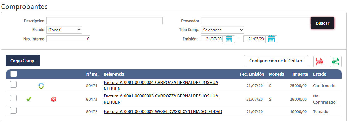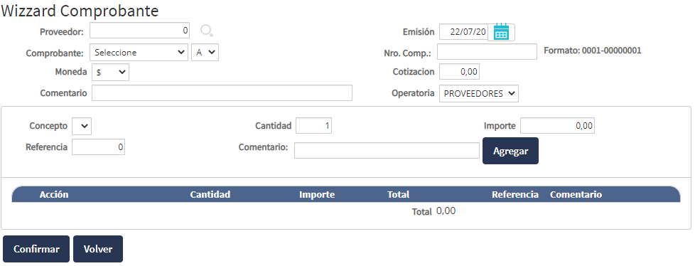 Cuando se hace click en el botón “Carga Comp.” En el ABM de Comprobantes, se ingresa a la pantalla unificada de carga de comprobantes.