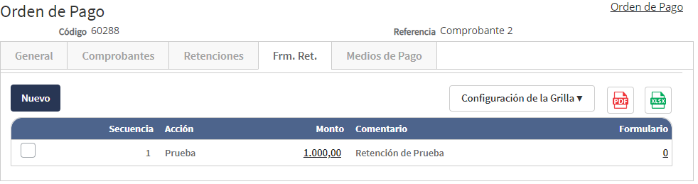 Reg. Obl?: Valores “Si” o “No”. Los que son “Si” se van a ejecutar siempre, los “No” solo cuando en la orden de pago se haya parametrizado una cuenta de pago a cuenta.