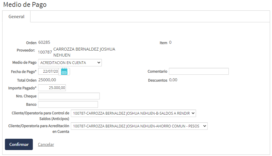 Tipo: Los valores posibles son “Pago” o “Anticipo” y tiene que ver con las acciones que se van a generar dependiendo si la Orde de Pago es sobre comprobantes de tipo “Anticipo” u otros.