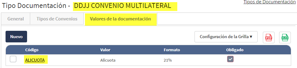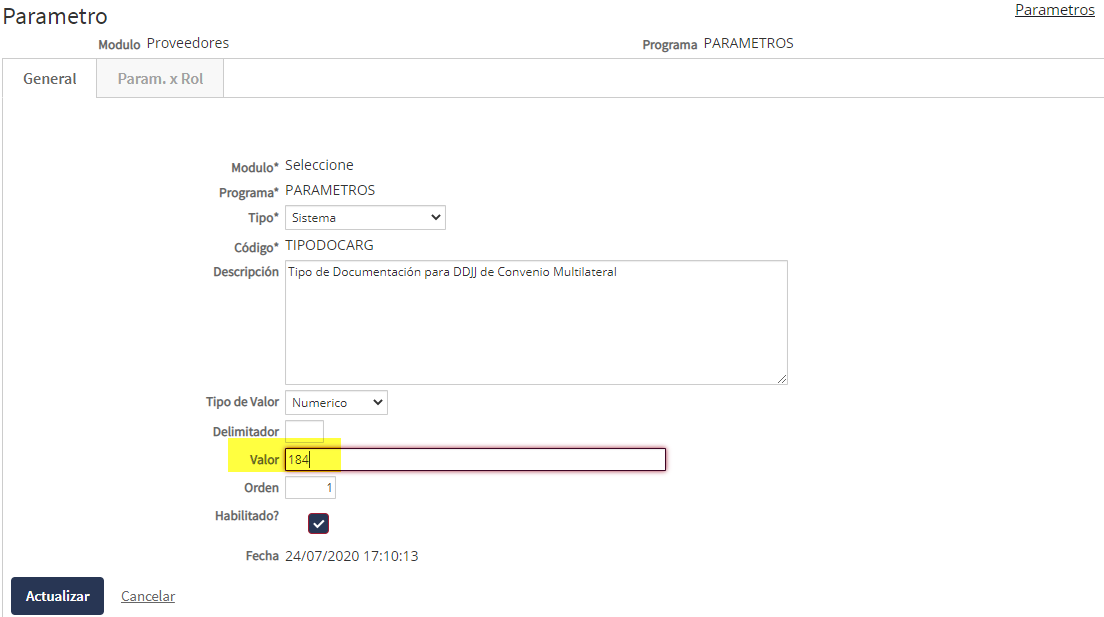 Al hacer click sobre “Nuevo” se ingresara al alta de la parametrización: