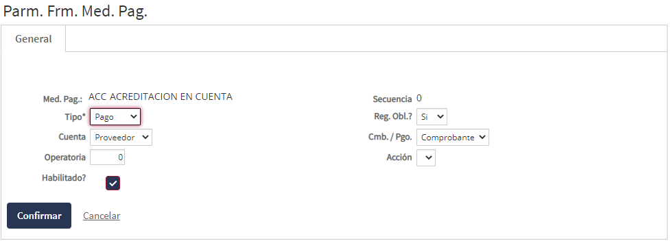 Para acceder a esta tabla, se deberá agregar la pestaña “Param. Frm.” dentro del menú de “Medios de Pago”, luego de seleccionar un medio de pago.